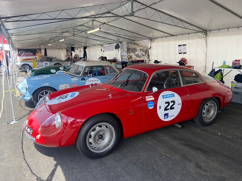 Der var sparsomt med storskærme (i modsætning til fx på Goodwood) og fra tribune T10 hhv. T12, hvor vi sad, kunne vi kun skimte én storskærm ved Dunlop-broen i det meget fjerne. Ikke optimalt, desværre. Så efter en lidt kedelig times tid på tribune T10 gik jeg en tur til depotet. Dér fandt jeg den Lola T70, som Jan Magnussen skulle køre, en Ford GT 40 som lynhurtige Alexander Brundle skulle sidde bag rattet af, en smuk Ferrari 250 GT SWB, en Ferrari 250 ”Breadvan”, en Maserati 61 ”Birdcage”, 8 stk. Lotus ”Climax” Eliter, to ”James Dean” Porsche 550 Spyder, en stribe heftige Porsche 356 og mange flere lækre og sjældne racerbiler. Jacob Viggo Holstein skulle også deltage i en Ferrari 275 GT og Erik Justesen/Christoffer Nygård skulle køre i Lotus 47 Europa. Jeg sendte en lind strøm af billeder af herlighederne fra depotet via Signal.